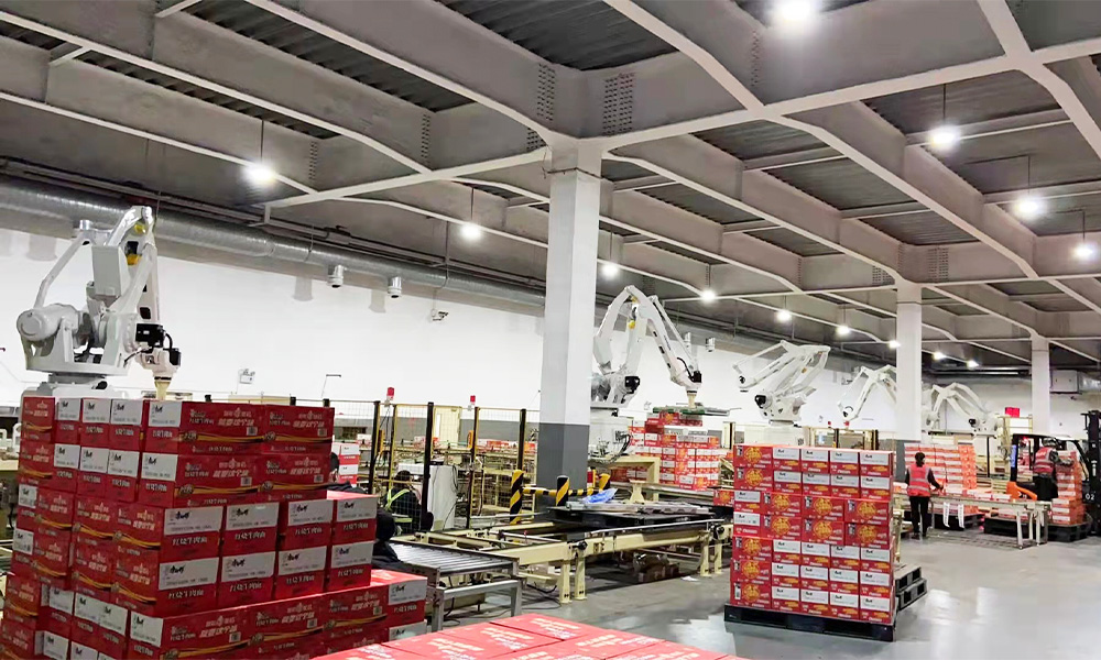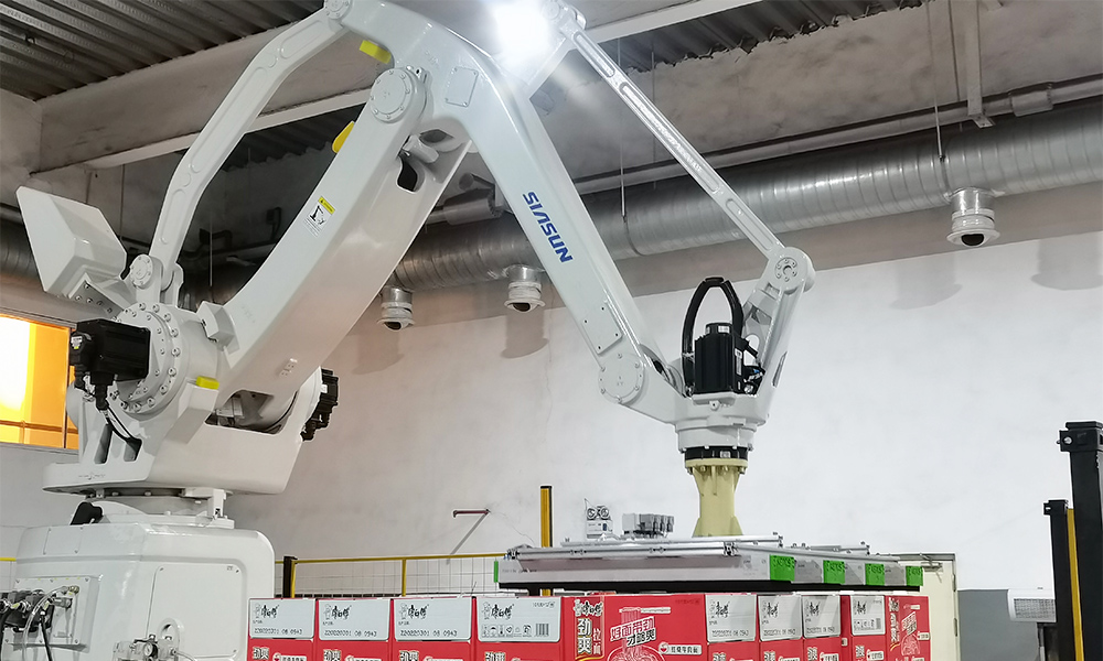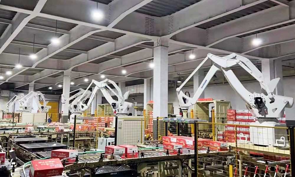 系統(tǒng)主要為成品面箱自動化輸送碼垛系統(tǒng)。由碼垛機器人吸取成品面箱按照預(yù)設(shè)程序碼垛到托盤上。根據(jù)產(chǎn)線分布及排產(chǎn)情況,每套機器人對應(yīng)兩條輸送線,提高了利用率。