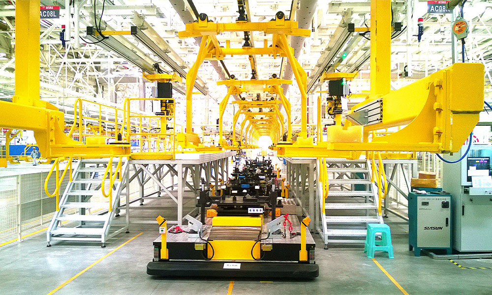 新松前、后懸總成底盤合裝移動機器人用于汽車主機廠總裝車間底盤產(chǎn)線,完成汽車底盤件的頂升并與車身完成拼合裝配。基于移動機器人自主運行,無軌道導引的特點,底盤合裝移動系統(tǒng)具有較高的柔性。可以根據(jù)工藝需要對機器人線路進行靈活調(diào)整。能夠滿足目前客戶多種車型混線生產(chǎn)的需要。