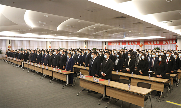 會(huì)議在莊嚴(yán)的國(guó)歌聲中開(kāi)啟各項(xiàng)議程,張進(jìn)總裁在會(huì)上作主題為《勠力拼搏啟新程 勇毅奮進(jìn)創(chuàng)未來(lái)》的年度工作報(bào)告。