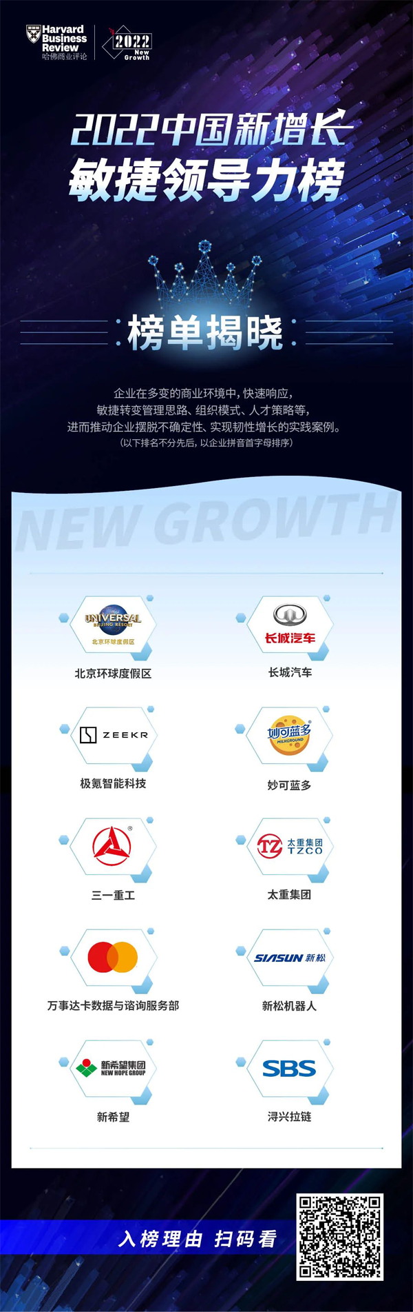 由《哈佛商業(yè)評論》中文版舉辦的“經(jīng)營確定性·2022新增長大會”于12月16日在京召開。新松公司因“以市場為導(dǎo)向,開展敏捷創(chuàng)新”榮登“2022中國新增長·敏捷領(lǐng)導(dǎo)力榜”。大會現(xiàn)場,來自智能與科技、新能源、互聯(lián)網(wǎng)、新消費等領(lǐng)域的企業(yè)家、管理者,與經(jīng)濟(jì)學(xué)家、學(xué)者們齊聚一堂,共同探討商業(yè)洪流中的確定性趨勢,以及商業(yè)文明的進(jìn)化與未來。