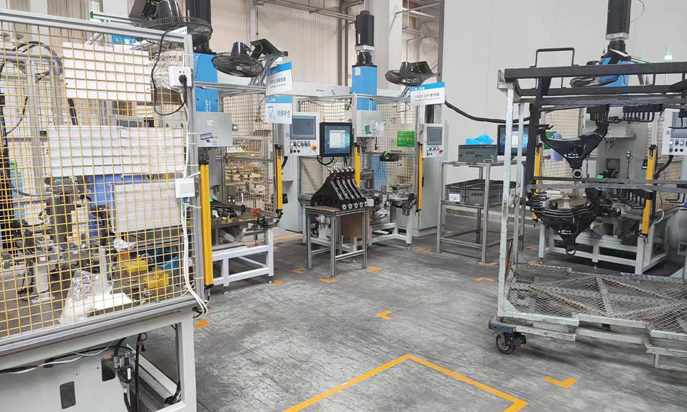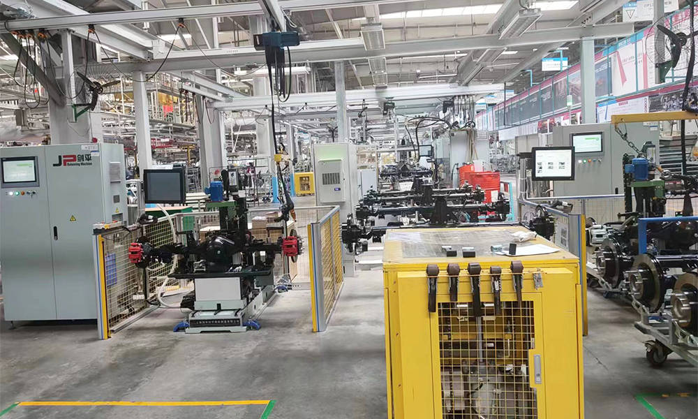 適用于汽車底盤總成裝配,包含后橋分裝總成裝配線、前減速器分裝總成裝配線、前轉(zhuǎn)向節(jié)和輪轂制動(dòng)器總成裝配線及前懸架下控制臂總成裝配線。產(chǎn)品主要用于承載式及非承載式車身底盤裝配。涵括生產(chǎn)管理系統(tǒng)、托盤夾具、物流輸送線、襯套壓裝機(jī)、橋殼涂膠機(jī)、擰緊機(jī)、打標(biāo)機(jī)、稱重注油系統(tǒng)、ABS傳感器檢測系統(tǒng)、盤跳檢測系統(tǒng)、泄漏測試機(jī)、翻轉(zhuǎn)機(jī)、懸掛起重機(jī)、鋼結(jié)構(gòu)、隔音間、照明風(fēng)扇系統(tǒng)等各種設(shè)備及工具。