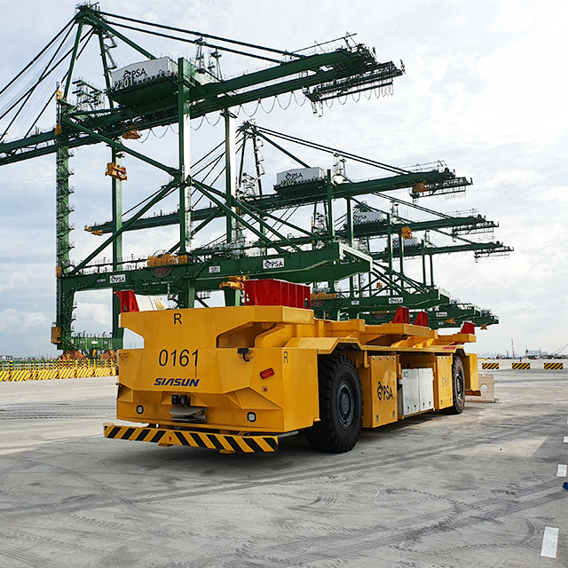 岸橋設(shè)備將船上的集裝箱抓取后,轉(zhuǎn)運(yùn)到下方等待的港口機(jī)器人上面,由機(jī)器人將集裝箱運(yùn)輸?shù)蕉褕?chǎng)區(qū)。在作業(yè)過程中,由于機(jī)器人需要經(jīng)過多個(gè)工作區(qū)域,機(jī)器人具備自動(dòng)停障功能,避免發(fā)生碰撞。在作業(yè)時(shí),機(jī)器人會(huì)根據(jù)系統(tǒng)計(jì)算,實(shí)現(xiàn)楔形變道,大大的提供了機(jī)器人作業(yè)的靈活性和通過能力,保證作業(yè)效率。在移動(dòng)機(jī)器人進(jìn)入堆場(chǎng)交互作業(yè)區(qū)后,負(fù)責(zé)堆場(chǎng)轉(zhuǎn)運(yùn)的場(chǎng)橋?qū)⒓b箱從移動(dòng)機(jī)器人上拿走,實(shí)現(xiàn)了整個(gè)作業(yè)過程。導(dǎo)航方式包括慣導(dǎo)定位、磁釘定位、RTK差分定位、UWB定位、激光輪廓定位、視覺定位、5G定位技術(shù)、GPS定位等。同時(shí),產(chǎn)品支持多類型載貨需求,可分別單次承載2x20英尺集裝箱、2x20英尺罐箱、40英尺集裝箱、45英尺集裝箱,滿足客戶的多種需求。產(chǎn)品已遠(yuǎn)銷海外并成功入駐世界著名港口投入使用。